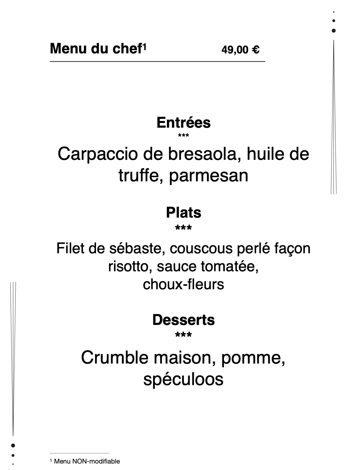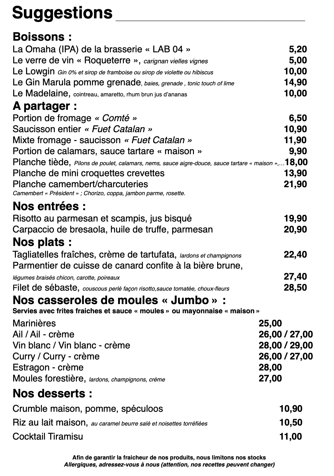Tous nos plats (poissons et viandes), sont accompagnés d’une salade mixte (sur demande) et de frites fraîches, croquettes, purée « maison » ou linguine
