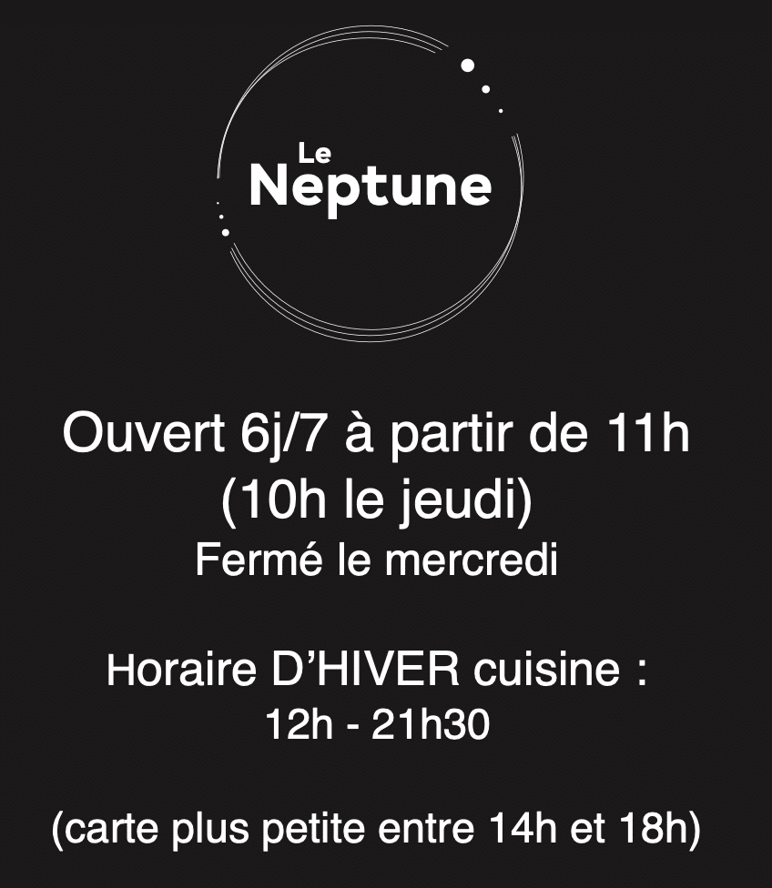 Le Neptune vous proposera une cuisine avec des plats « maison », composés de produits de qualité à des prix raisonnables, le tout dans une ambiance décontractée et chaleureuse.