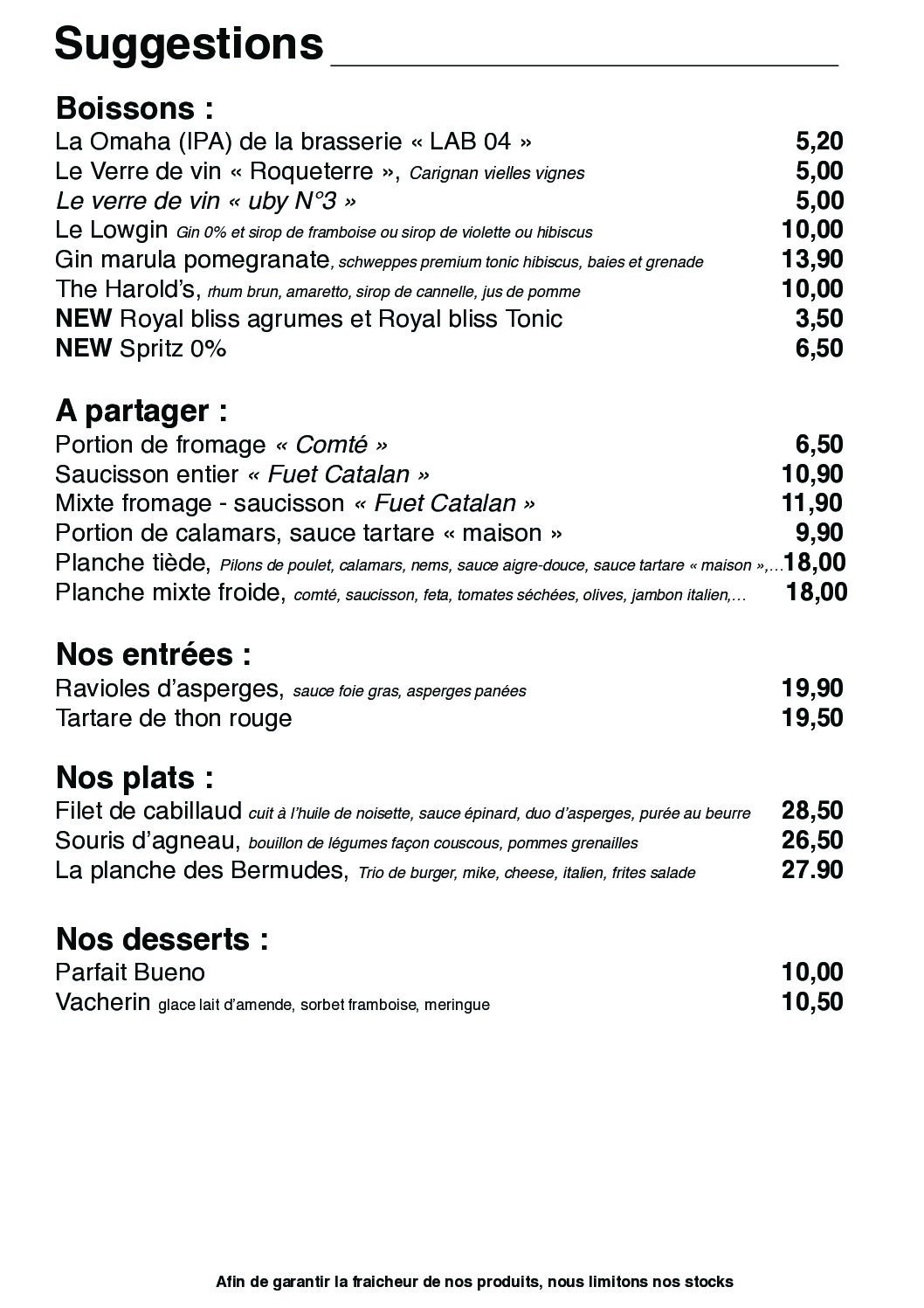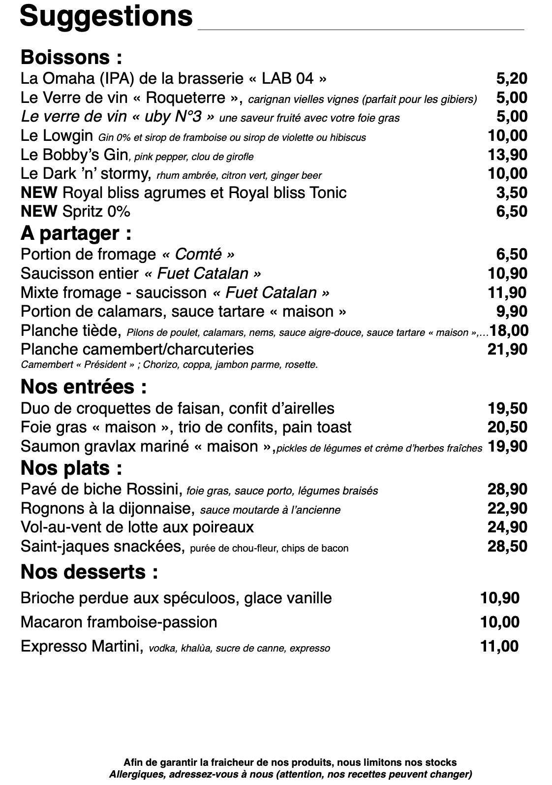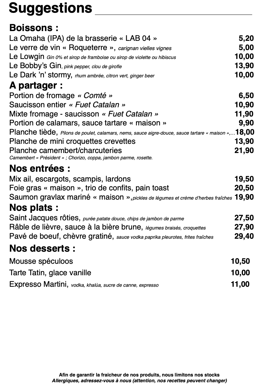 * Carte plus petite l’après-midi : plats disponibles